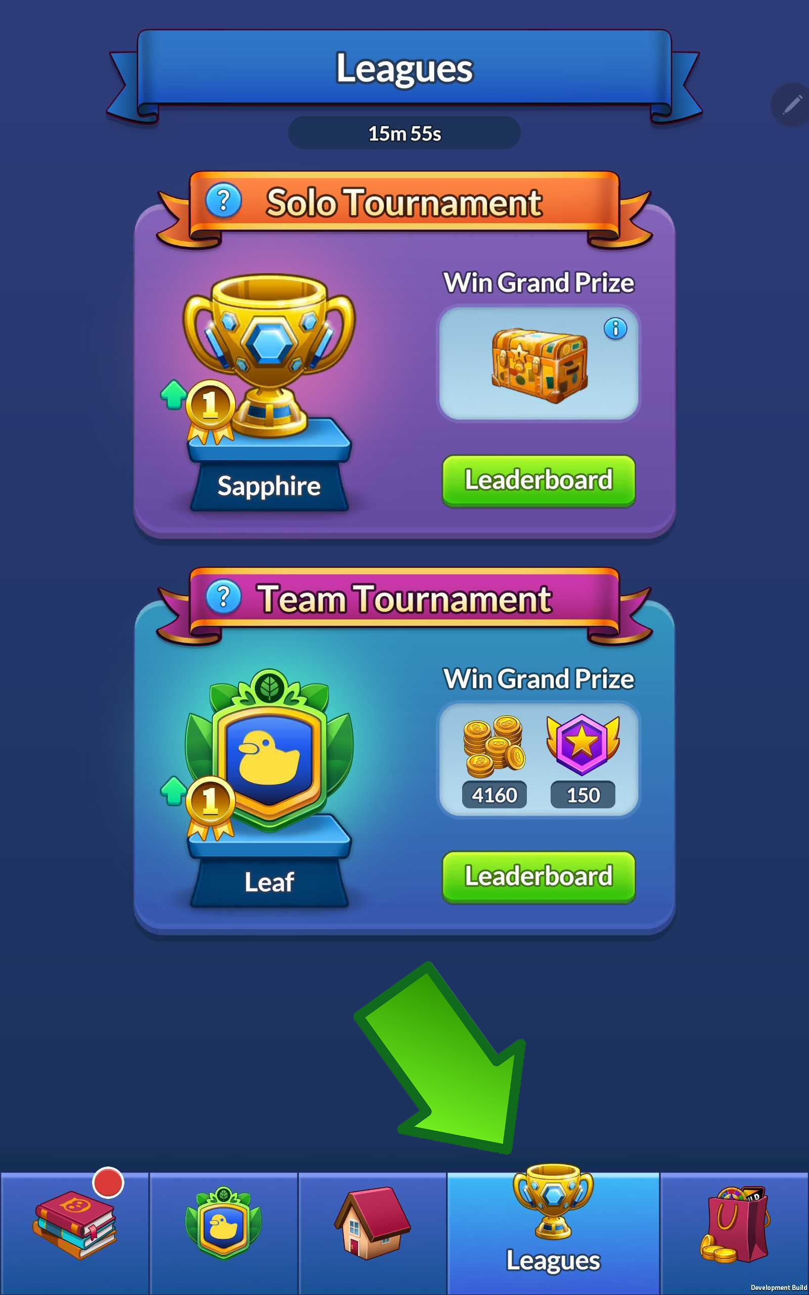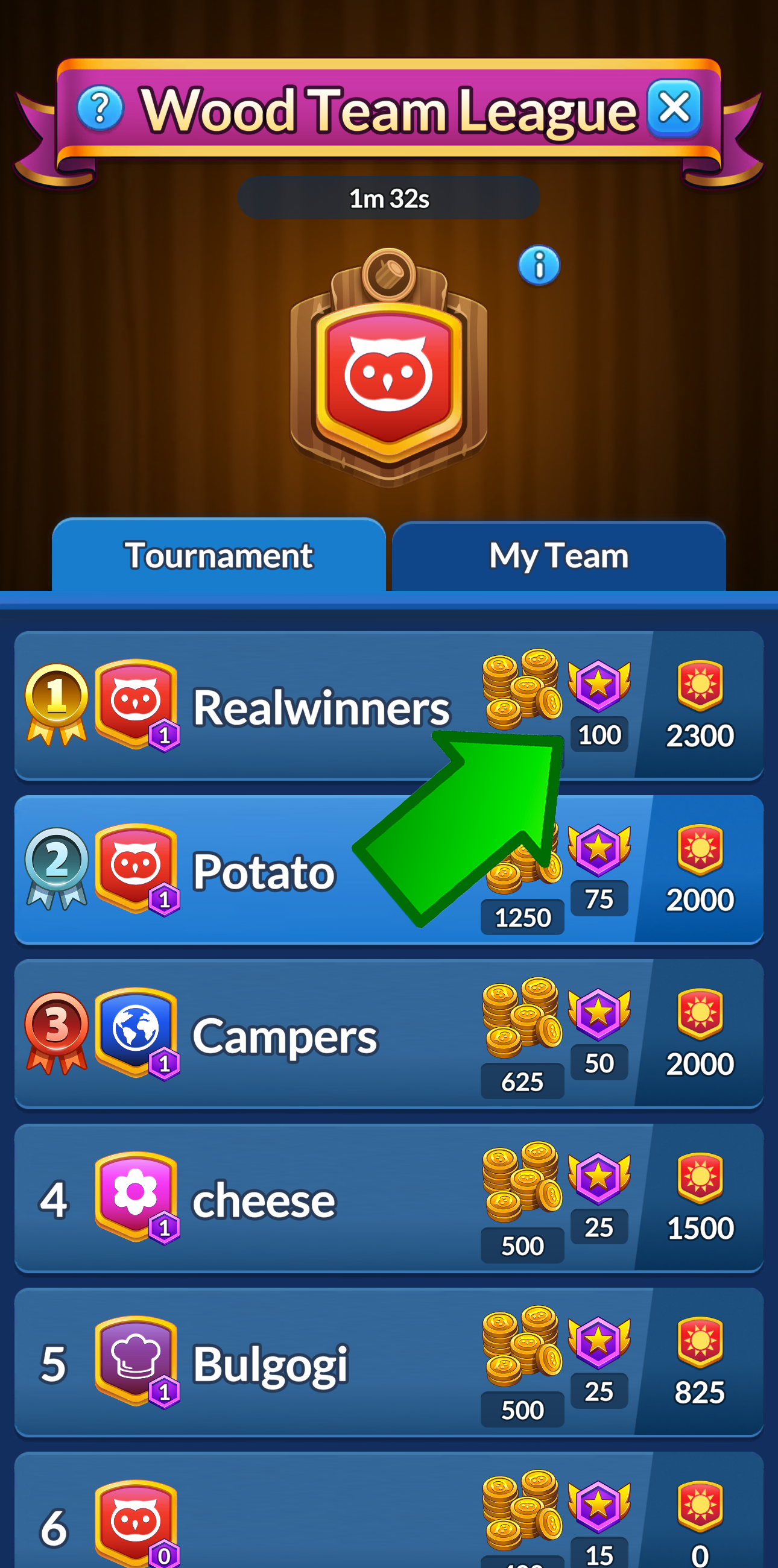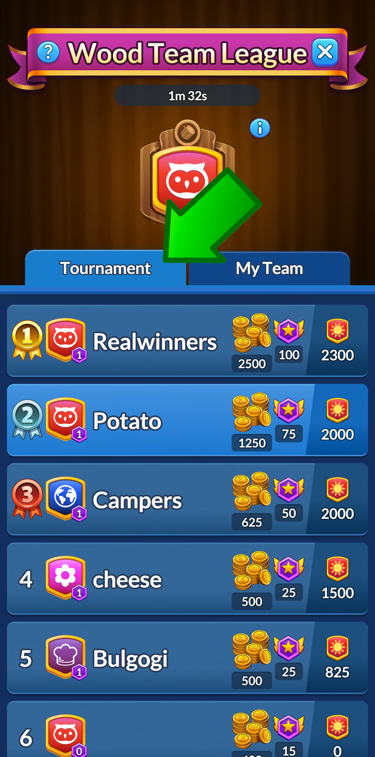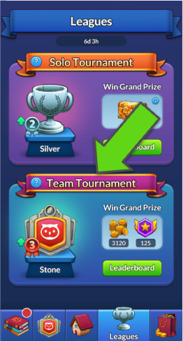 Anyone on a team enrolls their entire team into a Team League Tournament by completing a single level. Once enrolled players have access to the Team Tournament Leaderboard.
