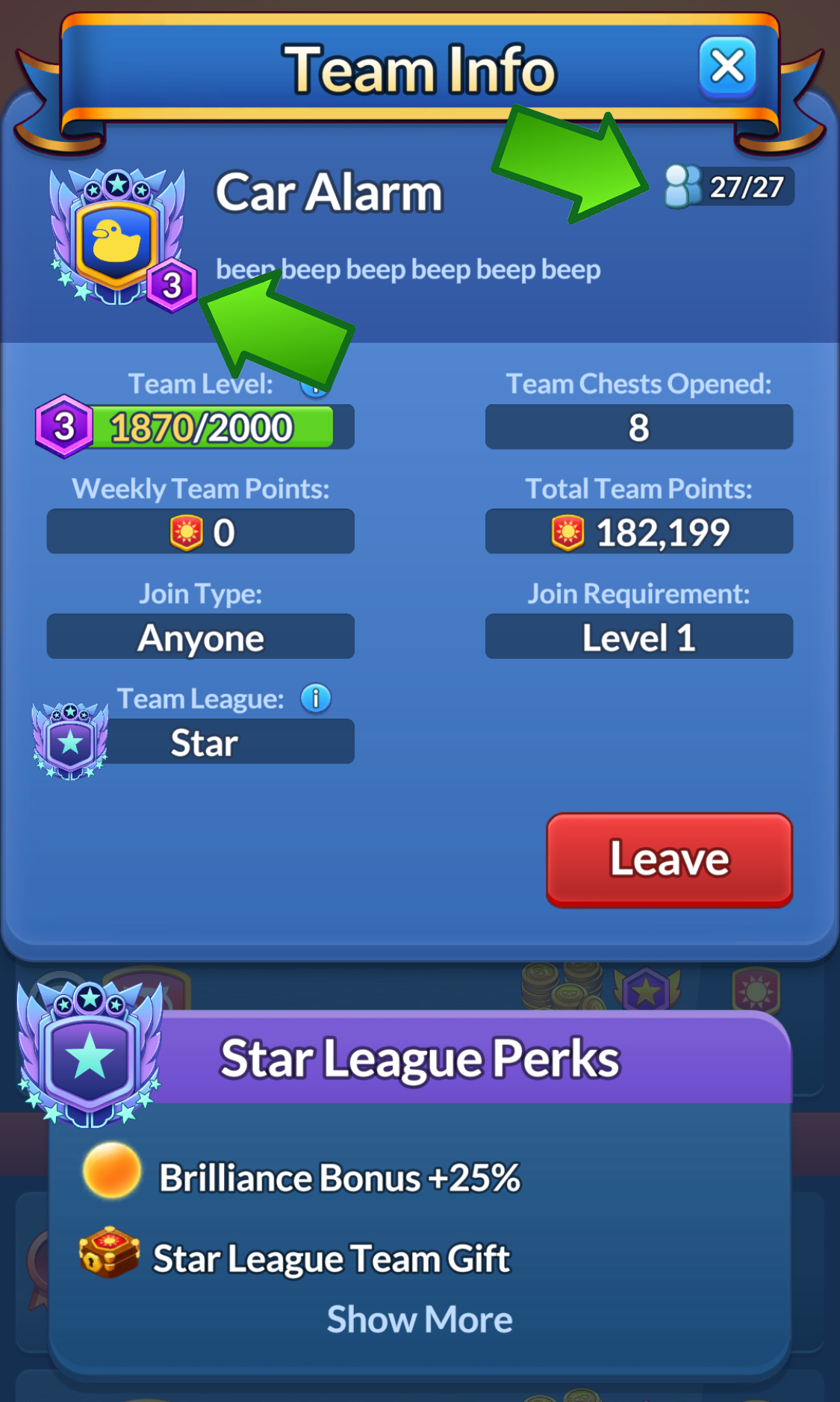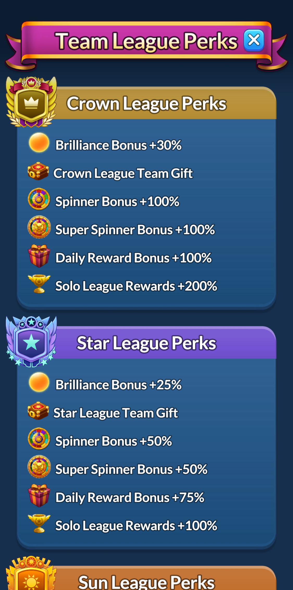 That will open the Team League Perks for all of the 9 leagues. Here are the lower and higher Team League Perks: