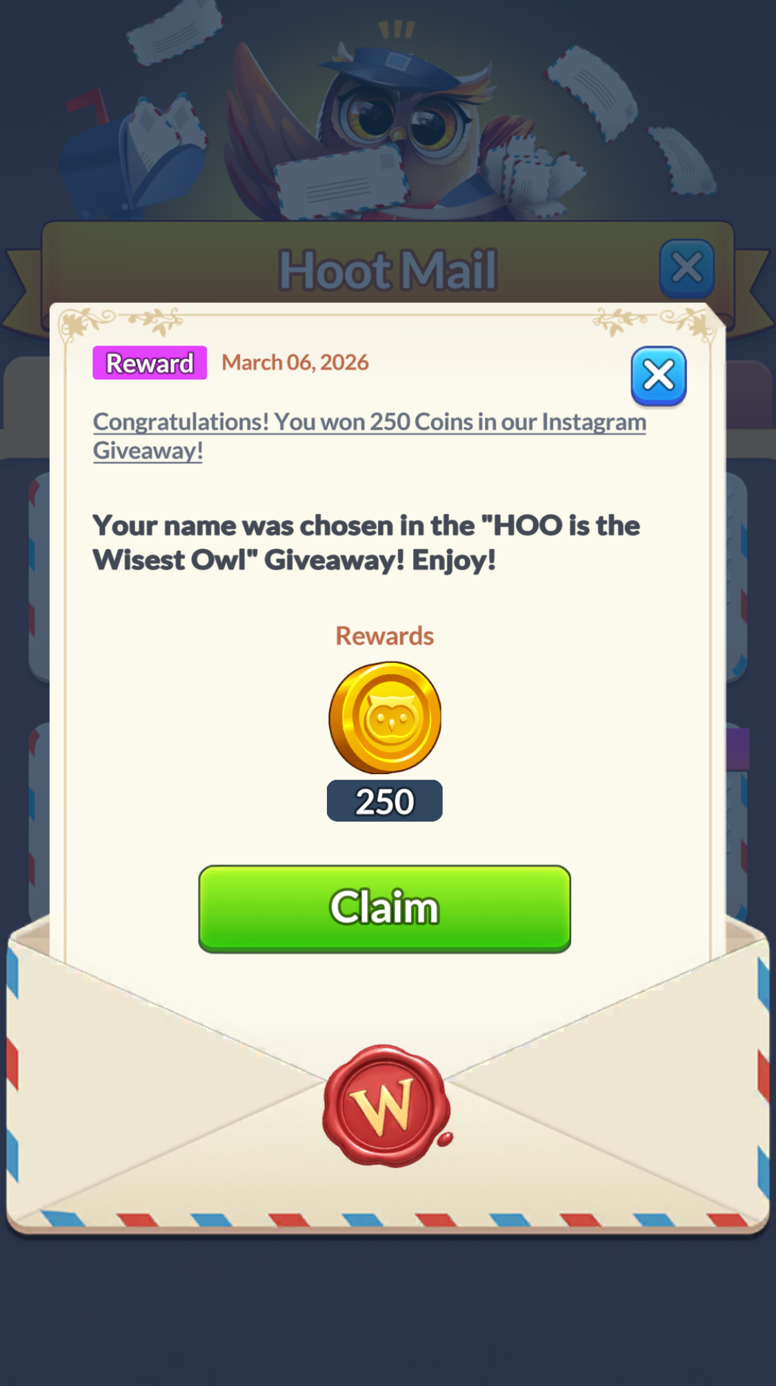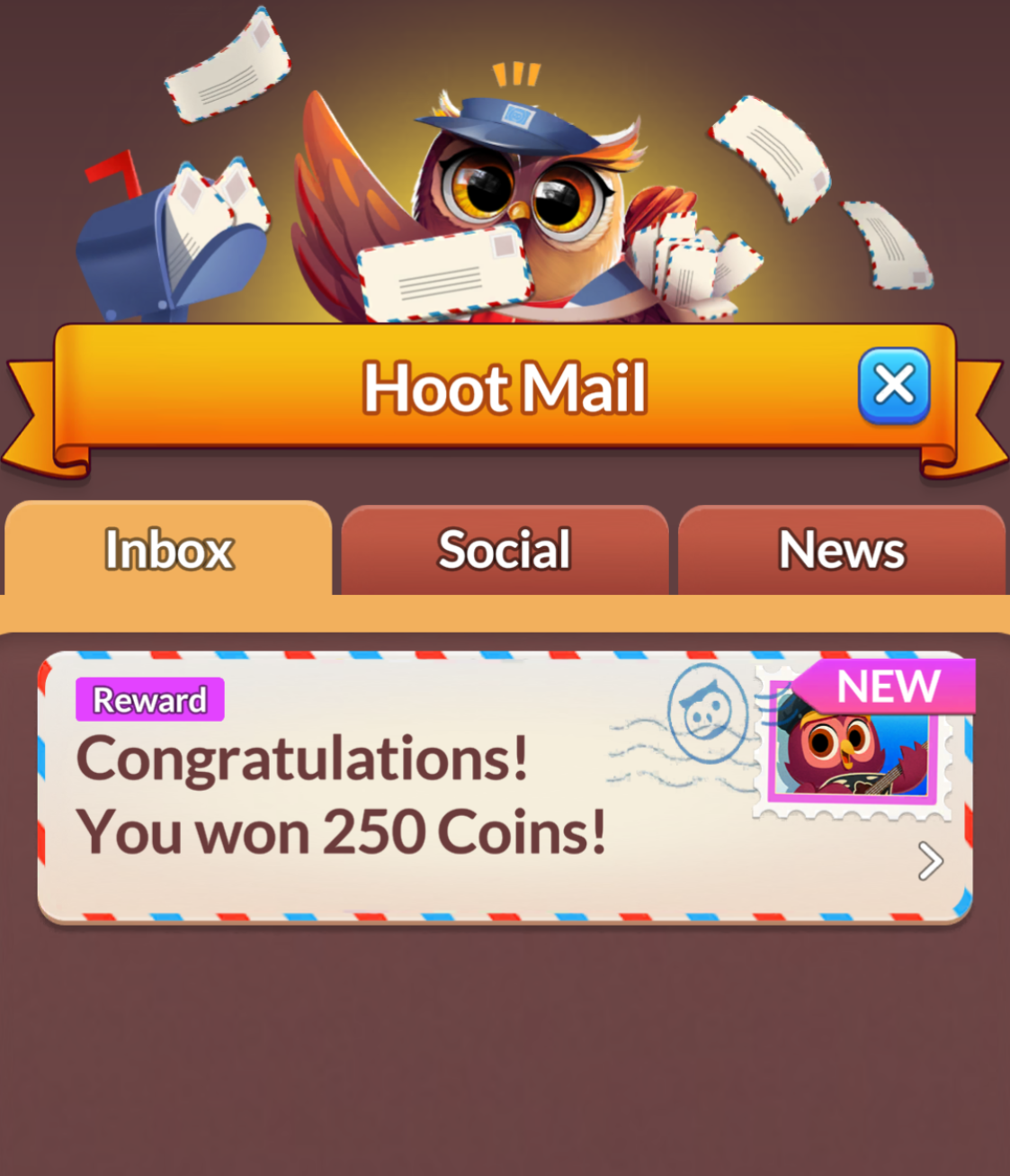 Collecting rewards, coins, and boosters from Hoot Mail is quick and easy!