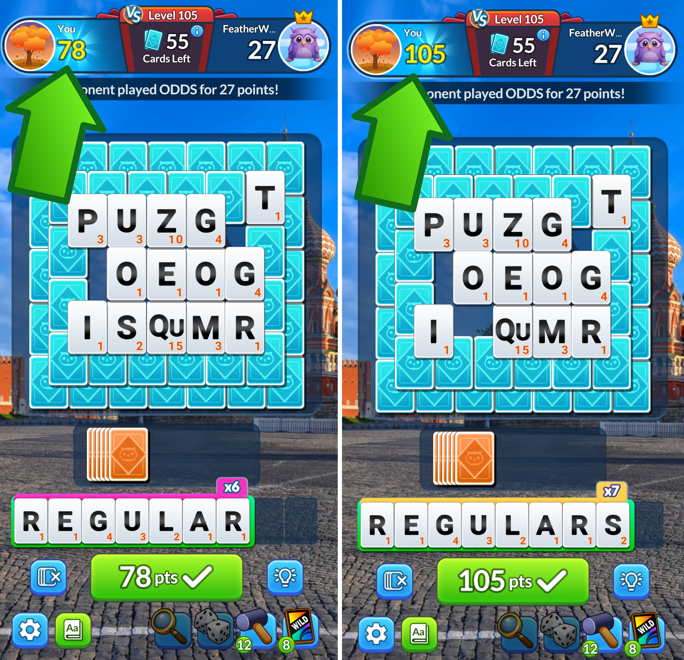 For example, in the case below, you can see the increase in points when an “S” is added to turn “REGULAR” into “REGULARS.”